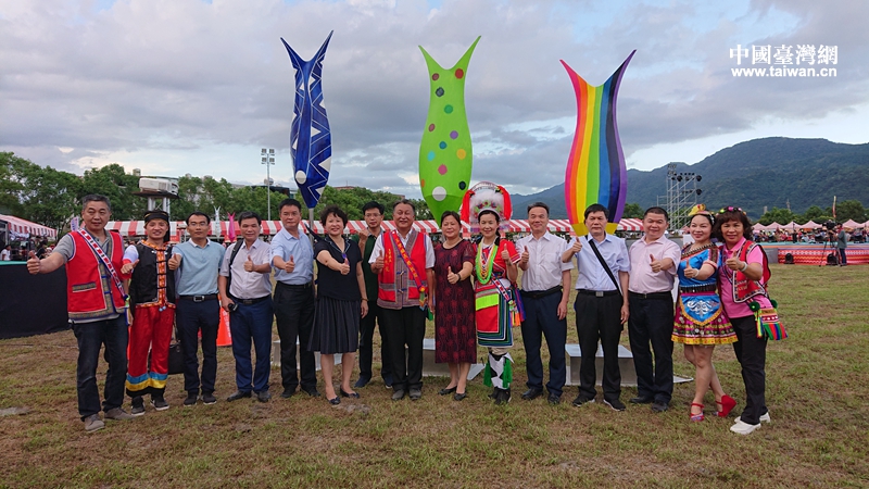 參訪團與花蓮縣縣長徐榛蔚,玉里鎮鎮長蔡秋龍、徐惠玲夫婦一同參加玉里2019年“原舞震璞石,傳唱縱谷情”聯合慶豐年活動,向玉里民眾獻上精彩的壯族歌舞和劉三姐的“繡球”,表達對玉里同胞節日的祝福和美好生活的期盼,與玉里民眾一起載歌載舞,共同演繹快樂,“兩岸一家親”在歌聲中飛揚,在舞步中激蕩。