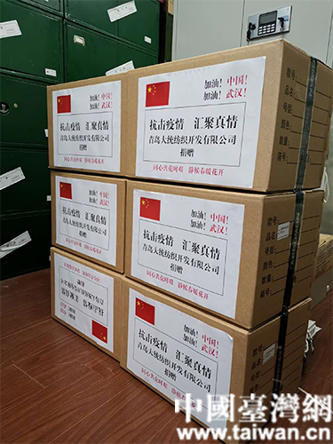 “同心共克時(shí)艱,靜候春暖花開”,一行溫暖的字寫在臺(tái)資企業(yè)青島大統(tǒng)紡織開發(fā)有限公司捐贈(zèng)物資的包裝上。(圖片來源:山東省臺(tái)港澳辦)