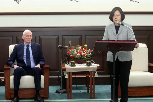 蔡英文(右)會(huì)見“美國在臺(tái)協(xié)會(huì)”主席莫健(左)。(圖片來源:臺(tái)媒)