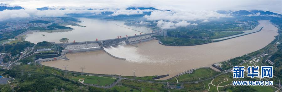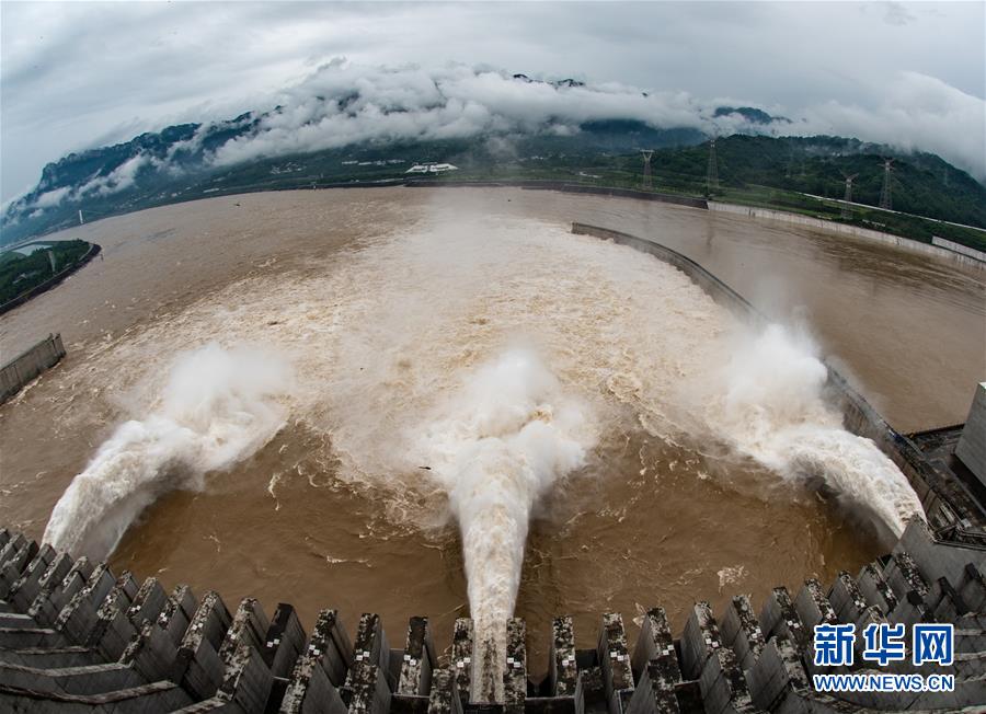 長江三峽樞紐開啟泄洪深孔泄洪(7月2日攝)。新華社發(鄭家裕攝)